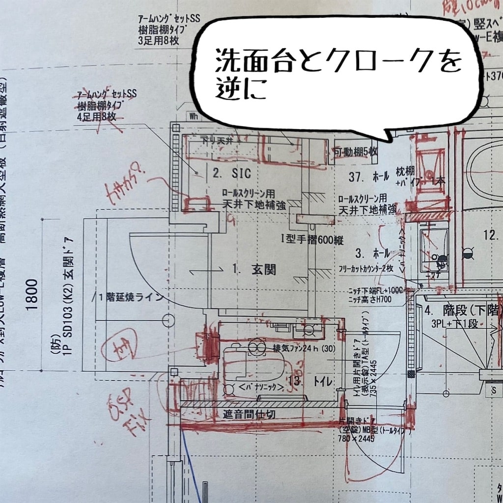 玄関入って正面が洗面台は違和感があったので、クロークと位置を逆に。