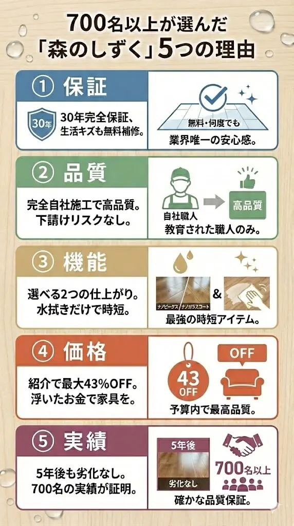 森のしずくは、30年間無償保証の施工実績20万件以上のフロアコーティング会社です。