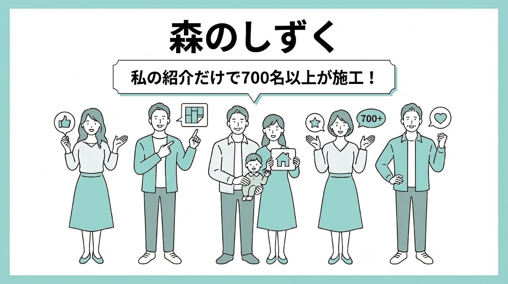 私のブログは森のしずく公認の紹介実績があり、2025年現在も変わらず最大43%OFF(※条件による)の紹介割引が適用されます。700名以上の施主様が利用された、最も安心なルートです。